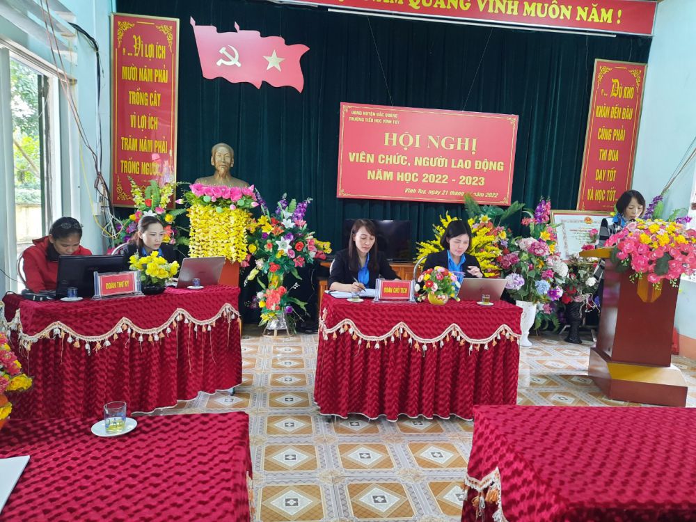 Sáng ngày 21/10/2022, CĐ trường trường Tiểu học vĩnh Tuy đã phối hợp với nhà trường tổ chức Hội nghị viên chức, người lao động năm học 2022-2023, nhằm phát huy quyền làm chủ. Hội nghị đã thông qua dự thảo báo cáo kết quả thực hiện Nghị quyết Hội nghị năm học 2021-2022, phương hướng nhiệm vụ năm học 2022-2023; Báo cáo tổng kết phong trào thi đua năm học 2021-2022 và phương hướng phong trào thi đua năm học 2022 - 2023; Quy chế dân chủ; Quy chế chi tiêu nội bộ, ... Trên cơ sở nội dung các báo cáo hội nghị đã đi đến biểu quyết các chỉ tiêu nhiệm vụ năm học 2022 - 2023. Hội nghị đã diễn ra thành công tốt đẹp